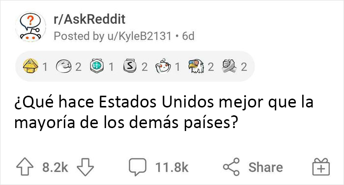 Así que echemos un vistazo a un reciente post de Reddit del usuario KyleB2131 que preguntaba a la gente: "¿Qué hace Estados Unidos mejor que la mayoría de los demás países?". Más concretamente, sus 11.800 comentarios, en los que la gente ha enumerado todas las cosas de las que creen que Estados Unidos debería estar orgulloso.
