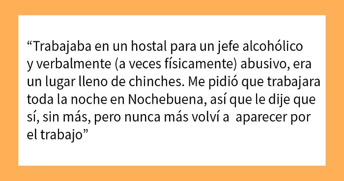 Trabajé en un albergue de m*erda para un jefe alcohólico que abusaba verbalmente (a veces físicamente) de mi, en un lugar infestado de chinches. Me pidió que trabajara la noche en Nochebuena (donde yo sería la única que trabajaría) el día anterior, así que acepté y nunca volví a presentarme a trabajar. Me dejó como 50 mensajes de voz enojados diciéndome lo mucho que lo jodí y que tuvo que hacerlo él mismo y se perdió la Navidad. Fue divertido.