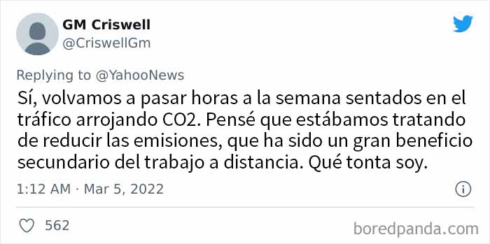 Sin embargo, la gente no se siente muy animada al respecto. Con tantos que han demostrado con éxito que pueden realizar sus tareas igual de bien (si no mejor) trabajando a distancia y con los precios del gas que siguen subiendo debido a la invasión rusa de Ucrania, no es de extrañar que a algunos no les guste la decisión. Para entender mejor los motivos, hemos echado un vistazo a las redes sociales, donde los usuarios han expresado sus quejas.