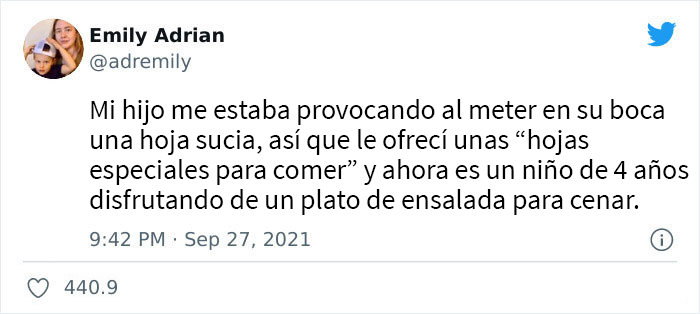 Después de que su hijo la “provocara” varias veces al ponerse una hoja sucia dentro de la boca, Adrian decidió aprovechar esta travesura para ofrecerle a cambio “hojas especiales para comer” y así fue como logró hacer que su hijo se comiera un cuenco repleto de ensalada.