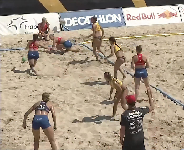 Según la normativa de la Federación internacional de balonmano, las mujeres «deben llevar bragas de bikini», pero a los hombres se les permite llevar pantalones más largos