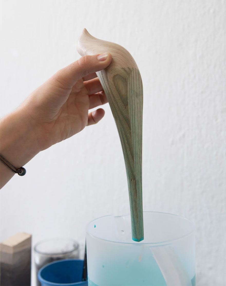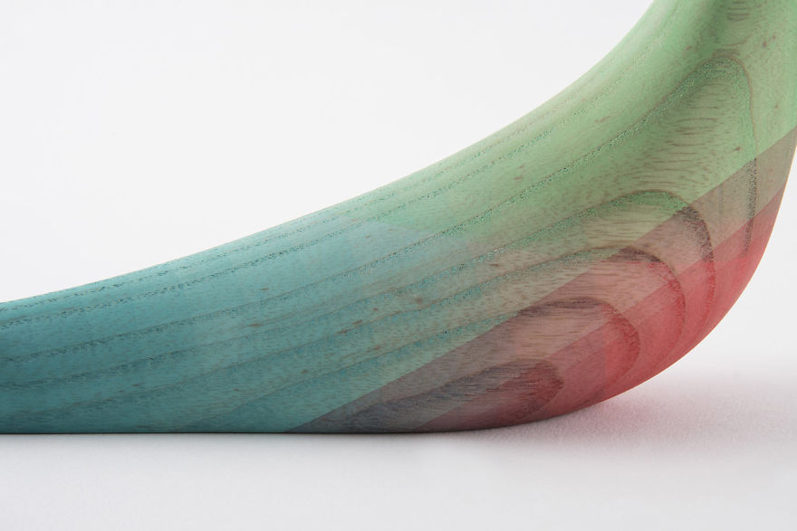 «Creamos la formas suaves y continuas con tecnología CNC y lo contrastamos con la pintura a mano, hecha sumergiendo las figuras en agua coloreada,» dijo Hernández. «Esta técnica de pintura permite adquirir una textura interesante con intersecciones y transparencias hechas con capas de color que parecen el plumaje de las aves.»