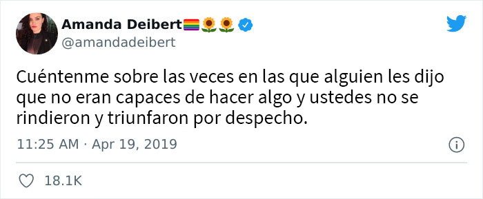 La escritora de televisión y comics Amanda Deibert empezó un interesante hilo en Twitter que rápidamente se hizo viral. Le dijo a las personas que contaran sobre las veces que alguien les dijo que no podían hacer algo y pudieron lograrlo por puro despecho.