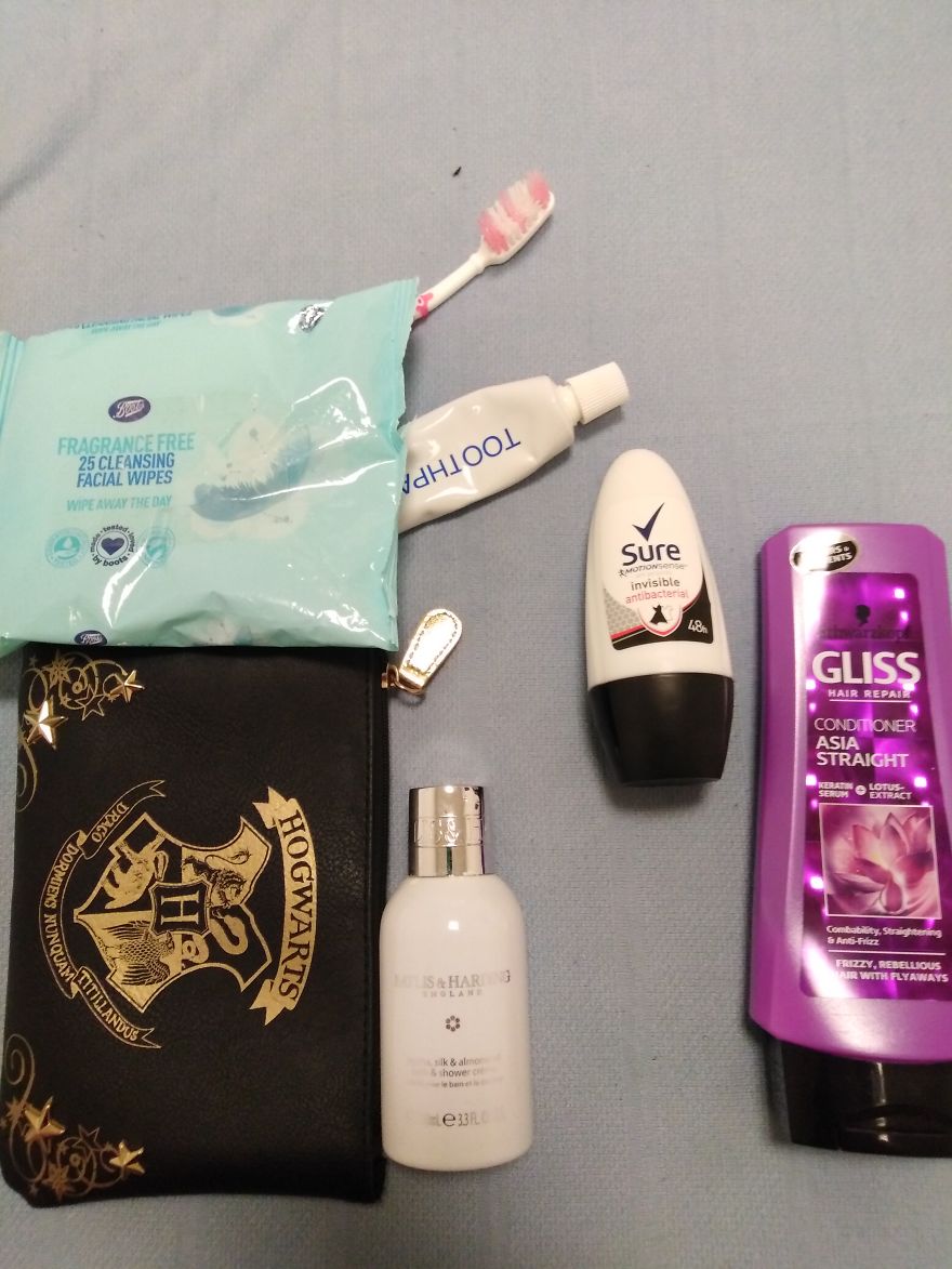 Yo siempre me traigo mi propio neceser. Si eres una mujer, tienes que traerte tus productos sanitarios, ya que no te los dan en la mayoría de sitios (gracias a los recortes). No permiten sprays, así que el desodorante es de rolón.