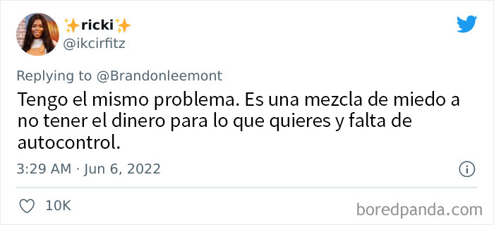 "Creo que mi mayor problema financiero es que crecí pobre", tuiteó. "Así que ahora que gano mi propio dinero, no sé cómo presupuestar. Siempre voy a gastar el centavo extra por la calidad porque puedo y odio la sensación de estar limitado en lo que puedo hacer en función de una etiqueta de precio."
