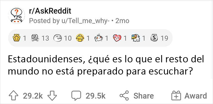 Pues bien, el Redditor Tell_me_why- ha hecho precisamente eso al dirigirse a la comunidad Ask Reddit: "Estadounidenses, ¿qué es lo que el resto del mundo no está preparado para escuchar?". El post se convirtió inmediatamente en un éxito. Miles de usuarios no perdieron el tiempo escribiendo las cosas extravagantes que la gente de otros países desconoce, y compartiendo algunas duras verdades por el camino.