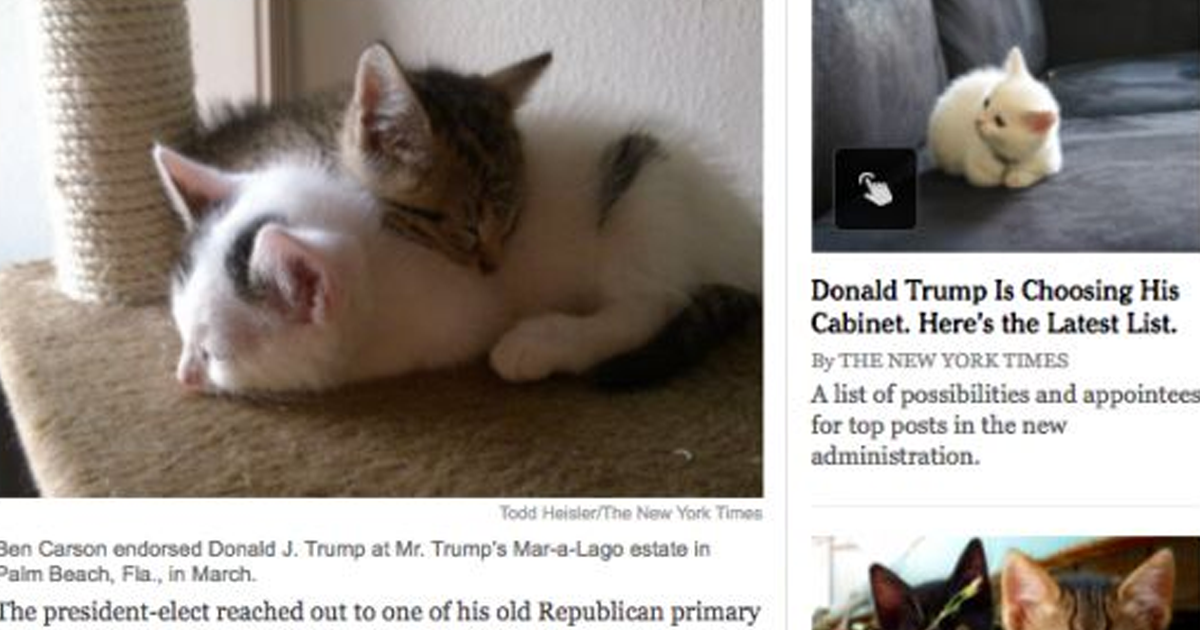 Si lees las noticias a menudo, probablemente estarás harto de ver el careto de Trump por todas partes de la red. Por suerte, esta nueva e increíble extensión de Google Chrome llamada «Make America Kittens Again» te ofrece un poco de alivio, ya que reemplaza las imágenes de Donald Trump por… ¿lo adivinas? ¡Gatitos! La hemos estado probando y funciona genial en el New York Times y en Dailymail, pero no tanto en otras webs. Bueno, es mejor que nada, ¿no? Si la quieres, puedes descargarte aquí la extensión.