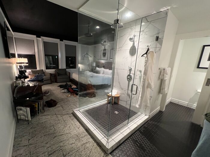 La ducha de mi hotel es un cubo de cristal en el centro de la habitación