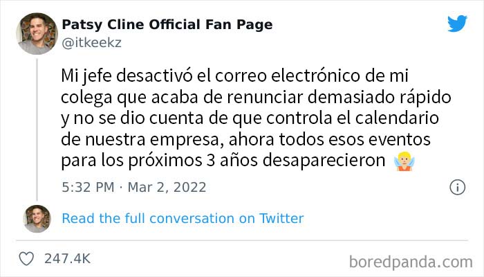 Recientemente, un usuario de Twitter que responde al nombre de @Itkeekz compartió un post en el que contaba cómo su jefe metió la pata hasta el fondo. "Mi jefe desactivó el correo electrónico de mi colega que acaba de renunciar demasiado rápido y no se dio cuenta de que controla el calendario de nuestra empresa", escribió, añadiendo que "ahora todos esos eventos para los próximos 3 años desaparecieron".
