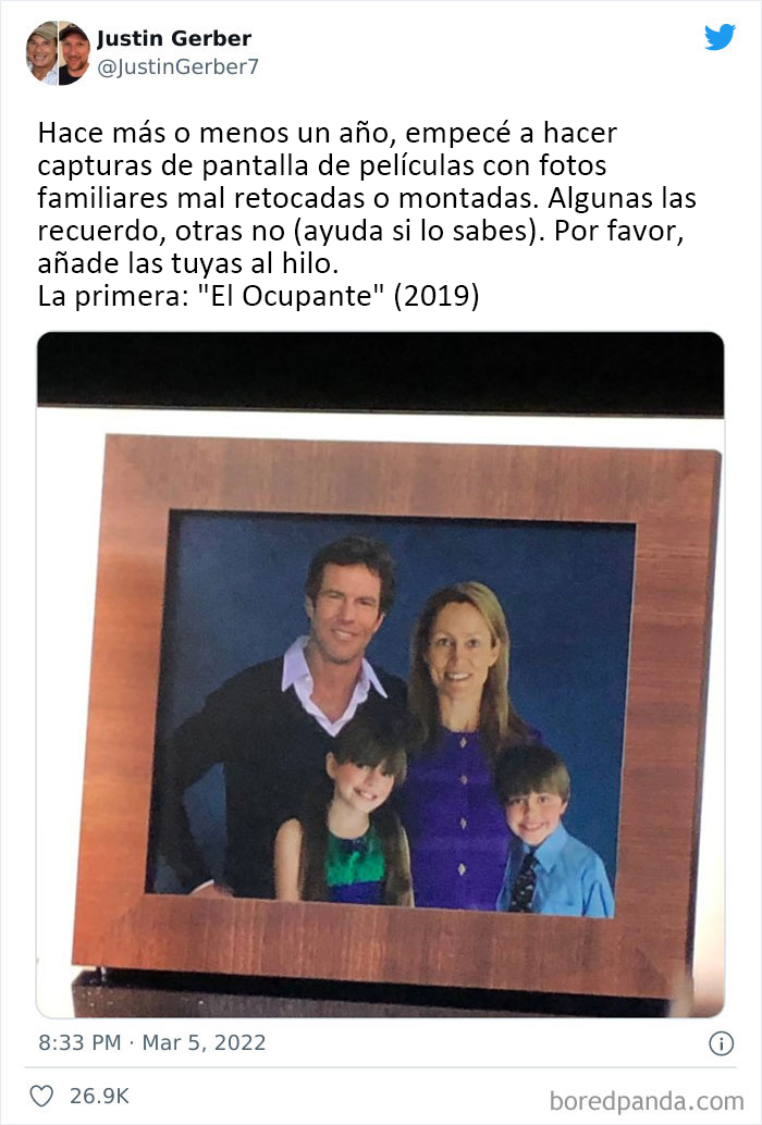 Justin Gerber, un aficionado al cine que ha visto más de 3.524 películas, quedó fascinado por coleccionar "fotos familiares mal retocadas/escenificadas" en las películas. Al darse cuenta de que no es tan raro encontrar estos divertidos y terribles photoshops, Justin compartió sus hallazgos en Internet y pronto, cientos de personas se unieron a la diversión y mostraron sus propios hallazgos únicos.