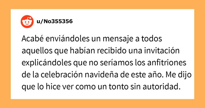 Resulta ser que su marido, cuyo padre falleció hace un año, ha asumido el papel de ser el nuevo “cabeza de familia” y pensó que sería una gran idea invitar a sus 26 familiares a una celebración navideña de 5 días sin antes consultárselo a ella.