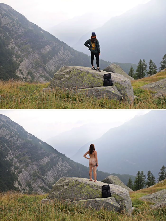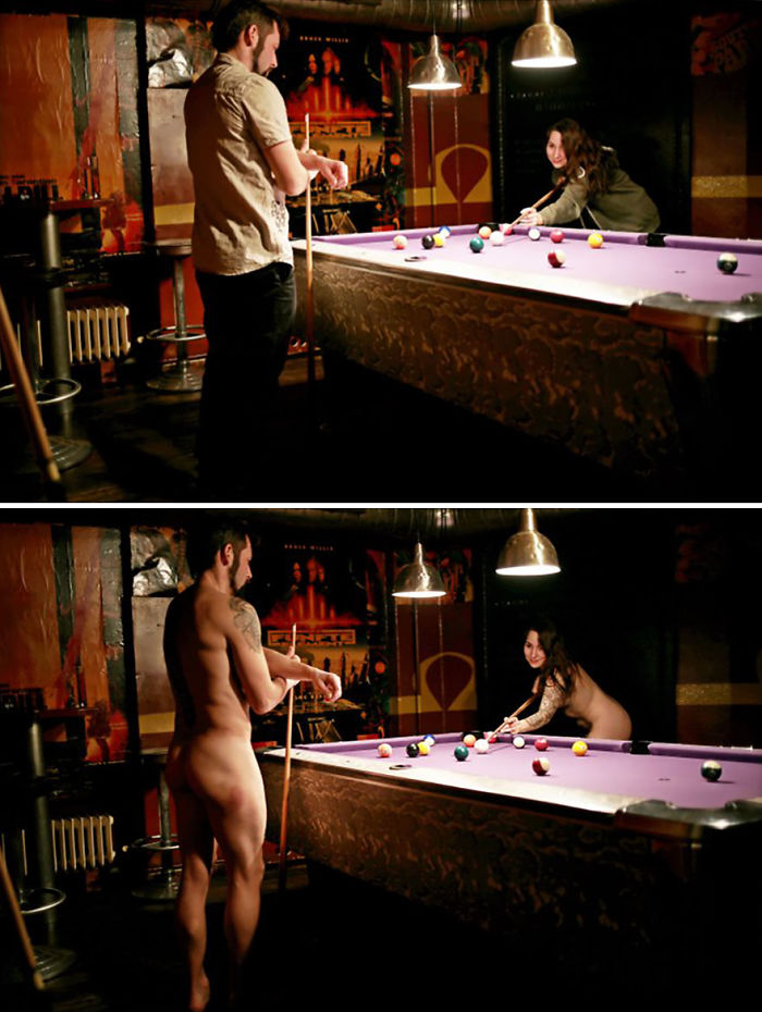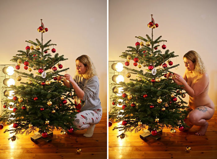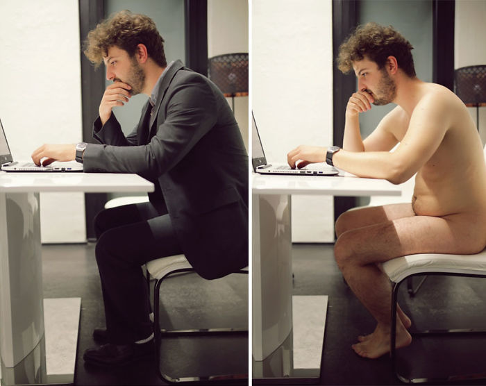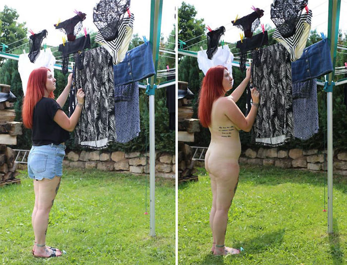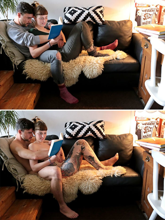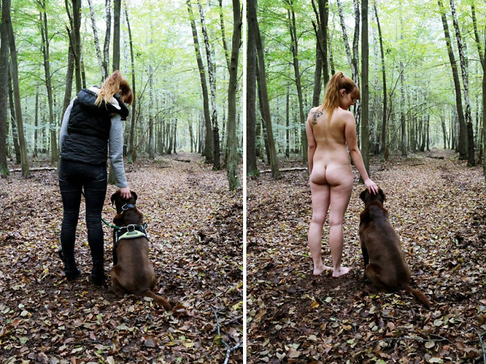 Cuando Sophia Voger acude a casa de quienes va a retratar para su proyecto "With and without" (con y sin), les pregunta cuales son sus hobbies. Ellos suelen decir cosas como "escuchar música" o "jugar con mi gato", y entonces Sophia les pide que lo hagan de forma normal, y después que lo repitan sin ropa. Saca fotos ambas veces y luego las compara.