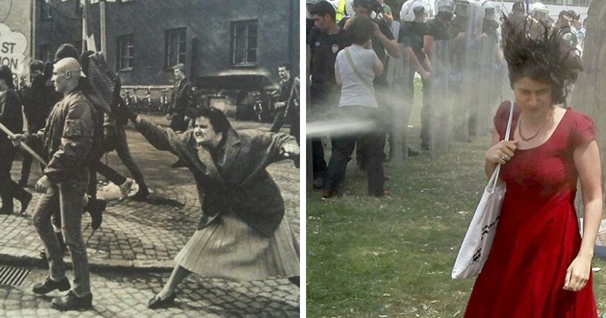"El 28 de mayo de 2013, durante las protestas turcas de Occupy Gezi, la "mujer de rojo", Ceyda Sungur, fue rociada con gas pimienta por la policía, lo que se convirtió en la foto definitoria del movimiento. Las protestas comenzaron contra la urbanización del Parque Gezi en Estambul, pero se transformaron en un movimiento nacional contra el creciente autoritarismo del gobierno derechista de Recep Tayyip Erdoğan. Trabajadora universitaria, Sungur no quería notoriedad, diciendo que "mucha gente que estaba en el parque y que también recibió gases lacrimógenos... No hay (una) diferencia entre ellos y yo". Posteriormente fue detenida por "provocar a la gente a desobedecer las leyes", aunque al año siguiente se desestimaron los cargos".