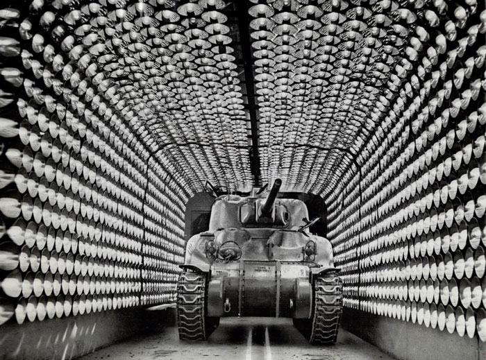Un tanque M4 Sherman recién pintado en un túnel con lámpara de infrarrojos, diseñado para reducir el tiempo de secado de la pintura de 24 horas a 4 minutos