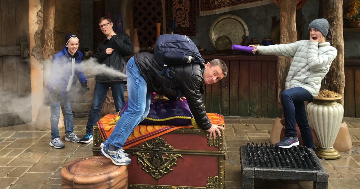 La idea de mi padre de una foto familiar en Disneyland París el año pasado (posando frente a una lámpara de genio)