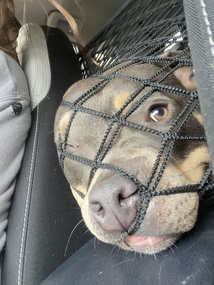 Mi hermana puso una red para que el perro se quedara en su asiento, pero él no lo acepta.