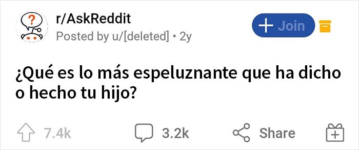 Creado por un usuario que ha sido borrado, planteaba a los padres la siguiente pregunta: "¿Qué es lo más espeluznante que ha dicho o hecho tu hijo?". Resulta que los niños reales pueden dar escalofríos tanto como los ficticios.