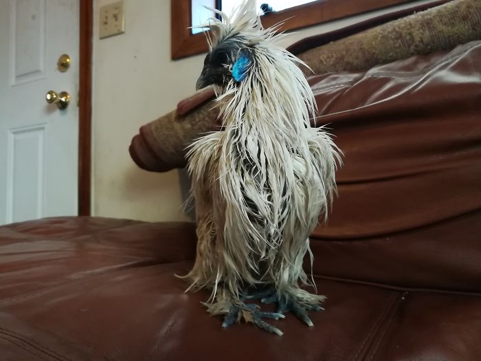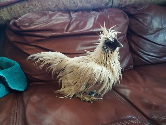 Minutos más tarde, teníamos una gallina mojada, confusa y ligeramente infeliz