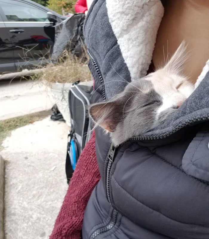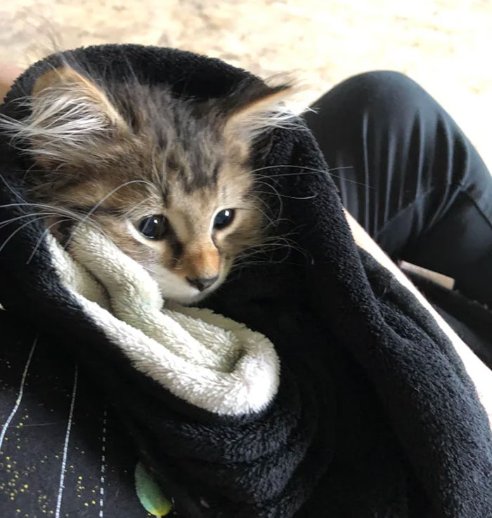 Conozcan a Fuzzynuckets. Hoy cumplió 6 años. Lo encontré abandonado en un hoyo en mi jardín cuando apenas tenía unas horas de vida, hace 6 años. El veterinario dijo que no sobreviviría. Vivía en el bolsillo de mi bata y bebía leche para gatitos de una botella pequeña