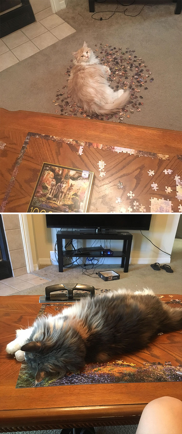 Algunos de los que estamos atrapados en casa esta cuarentena estamos intentando matar el tiempo haciendo puzzles. Pero no suelen ser fáciles de completar. Por suerte, los gatos están ahí para ayudarnos.