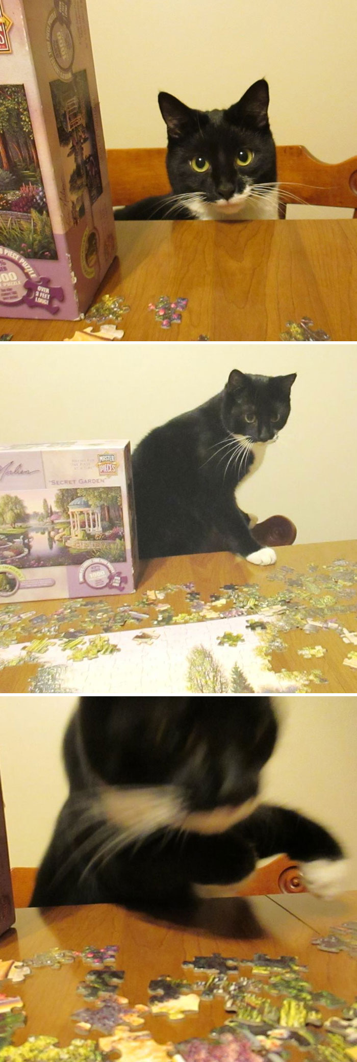 Si accidentalmente cubres el puzzle con una sábana y ya no puede respirar, no pasa nada, el gato la destrozará. O llevas horas peleándote con las piezas y ya no lo quieres ni ver, entonces tu bola de pelo lo tirará al suelo en cuanto vea tu frustración.
