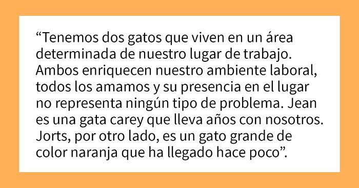 Pues bien, la historia nos dice que el lugar de trabajo del autor cuenta con dos gatos residentes: Jorts, un gato atigrado de color naranja, y Jean, una gata carey. Jean lleva viviendo allí un tiempo y es considerada como “la inteligente”, mientras que a Jorts… bueno, se lo describe como “un gato bastante simple”.
