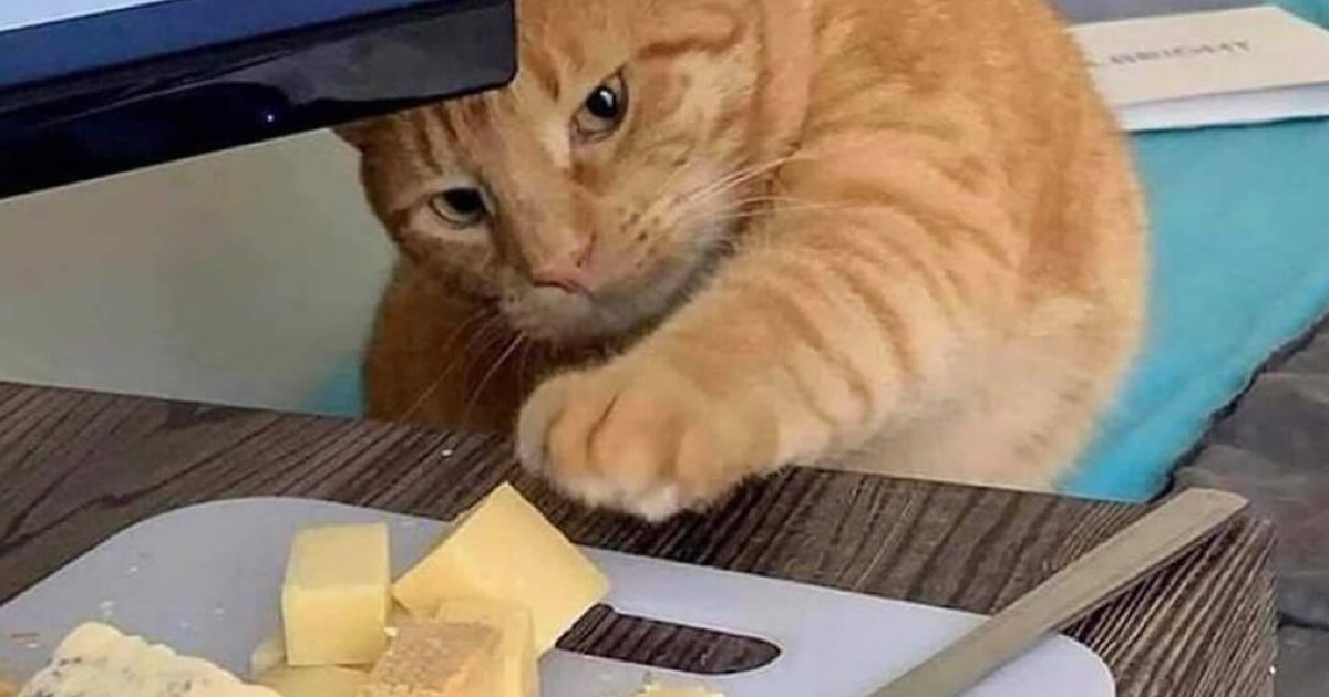 Gato naranja mostrando comportamiento caótico mientras intenta alcanzar trozos de queso sobre una mesa.