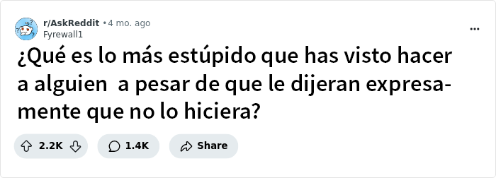 Recientemente, los miembros de la comunidad «Ask Reddit» debatieron sobre la abundancia de estupideces cometidas por jóvenes y adultos. Un usuario les preguntó: «¿Qué es lo más estúpido que has visto hacer a alguien a pesar de que le han dicho expresamente que no lo haga?» y la comunidad respondió.