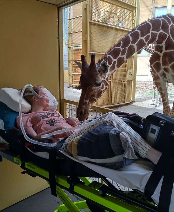 Jirafa saludando a una paciente terminal durante su último deseo en un zoo de Holanda