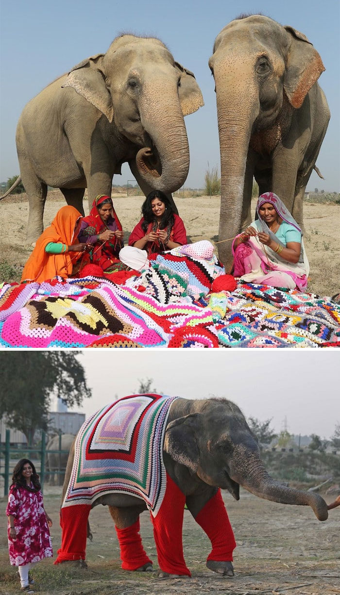 Las habitantes de este pueblo en India hicieron jerseis gigantes para estos elefantes rescatados