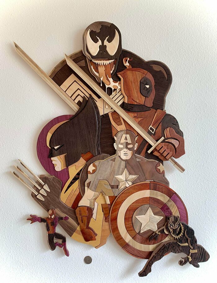 El caos de Marvel. Hecho de diferentes maderas. Todo natural, sin tintes. Colaboración con Tom Whalen. 3'x2'