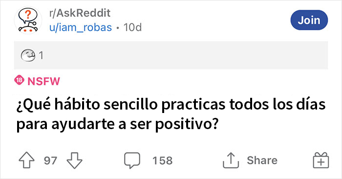 Creado por el usuario iam_robas, hizo esta pregunta a todos: "¿Qué hábito simple practicas a diario y te ayuda a mantenerte positivo?" No es la publicación más popular en la plataforma, pero la discusión en la sección de comentarios brinda información interesante sobre cómo las personas navegan en estos tiempos turbulentos.