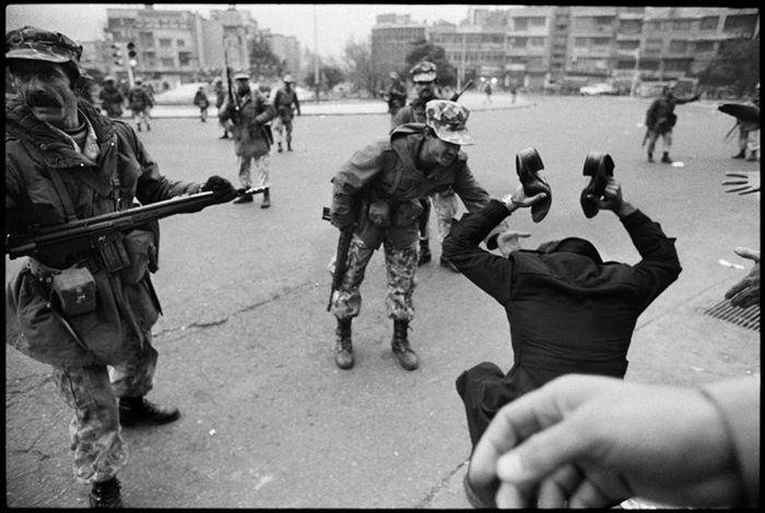 Foto realizada por Abbas, fotógrafo franco iraní, en Teherán, Irán, 1978. En ella se ve a un amotinado sosteniendo los zapatos de un amigo muerto, tras disparar los militares sobre la multitud. El militar le dice que no fue su unidad la que abrió fuego.