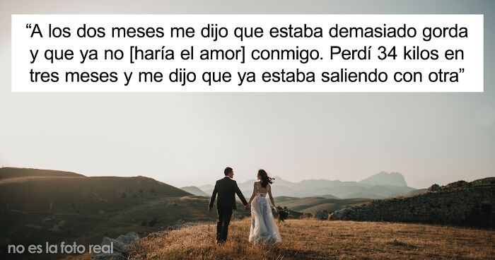 A los dos meses me dijo que estaba demasiado gorda y que ya no [haría el amor] conmigo. Perdí 34 kilos en tres meses (haciéndolo mal) y me dijo que ya estaba saliendo con otra. Parecía sorprendido de que mis padres ya no pagaran sus facturas, y le echaron de su propiedad 30 días después (según las leyes de mi estado).