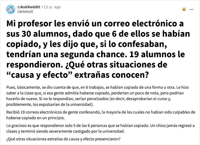 Algo similar a esto me pasó en mi primer año de universidad. Después de un trabajo escrito en la clase de literatura, el profesor entró y les dio la espalda a todos los estudiantes. Afirmó que alguien de la clase se había copiado descaradamente y exigió que, después, esa persona se reuniera con él en su oficina para hablar del asunto. Si esa persona aparecía, sería indulgente con el castigo. Noté que todos abrían los ojos como platos y se miraban fijamente. Sabía que yo no me había copiado, así que, después de clase, recogí mis cosas y me fui. Al pasar por la oficina del profesor, vi que había una fila de 20 estudiantes esperando para verlo.