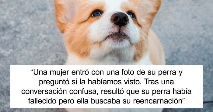 Una mujer entró con una foto de su perra y preguntó si la habíamos visto. Tras una conversación confusa, resultó que su perra había fallecido pero ella buscaba su reencarnación. Le expliqué que lo más probable era que su perra no tuviera el mismo aspecto, ni siquiera parecido, cuando se reencarnara, y que más bien debía buscar un perro joven que "se sintiera" igual; unas semanas después volvió con un cachorro de un refugio, dándome las gracias entusiasmada porque el nuevo cachorro no sólo no se parecía a su perra fallecida, ¡sino que había vuelto como un niño!
