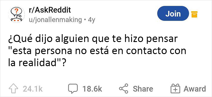 Pero aunque la ignorancia sea una bendición, al final no les llevará muy lejos. Así que jonallenmaking decidió pedir a los usuarios de Reddit que se sinceraran sobre los momentos en que alguien dijo algo tan ridículo que les hizo pensar: ““Esta persona no está en contacto con la realidad". Más de 18.600 comentarios después, nos recuerdan que hay mucha gente por ahí que lleva una vida muy diferente a la de la mayoría de nosotros.