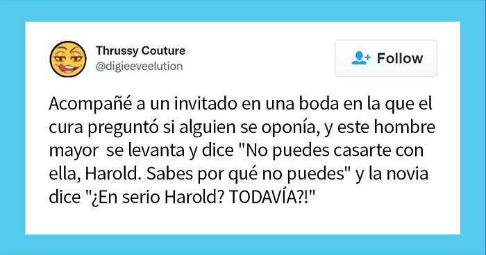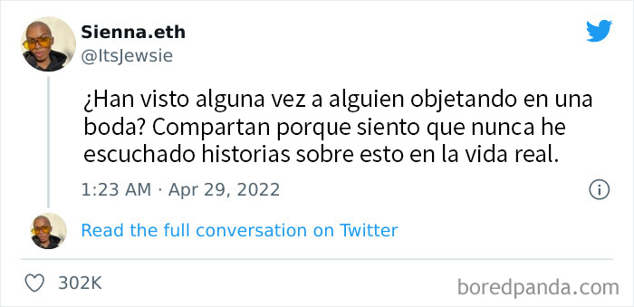 Sin embargo, este tipo de objeciones también ocurren en la vida real. Pero pueden ser muy diferentes de las que se ven en la pantalla. Los usuarios de Twitter de todo el mundo han colaborado y han contado algunas de las objeciones de boda más memorables que han presenciado, después de que la empresaria Sienna les pidiera que lo hicieran.