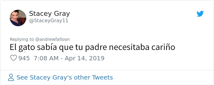 Según el tuit de Falloon, su madre dejó la puerta entornada y el gato aprovechó la oportunidad. «Mamá llegó a casa y los encontró acurrucados juntos en el sofá. Les hizo una foto antes de despertarle. ¡Se llevó una buena sorpresa!» Cuando luego visitó a sus padres, le enseñaron la foto y él la compartió con internet.