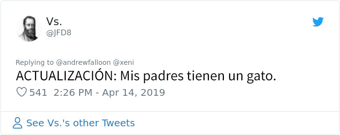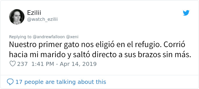 «Hasta ahora, mi padre no era muy fan de los gatos, pero parece que ha cambiado de idea. Parece que Ziggy ha adoptado a mi padre, así que no sé si querrán más gatos. Mis padres están contentos con sus habituales visitas.»