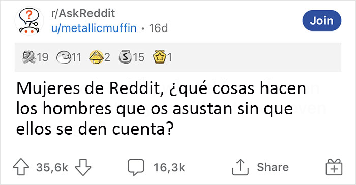 Frustrantemente, no todo el mundo se da cuenta de ello. Recientemente, la Redditor Metallicmuffin preguntó a las mujeres “¿Qué cosas hacen los hombres que os asustan sin que ellos se den cuenta?” y el hilo de conversación tocó de cerca a muchas personas. Las historias empezaron a llegar, cada una más sorprendente que la anterior, haciendo que el hilo se volviera viral con 35.600 votos positivos y 16.300. comentarios.