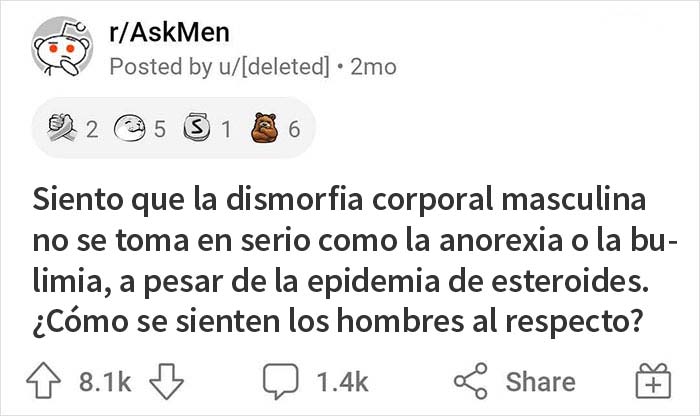 En el subreddit r/AskMen, los internautas han debatido sobre la dismorfia corporal masculina después de que un usuario les preguntara qué opinan sobre la marginación de este problema en comparación con la anorexia o la bulimia. A continuación encontrarán lo que tenían que decir, pandas.