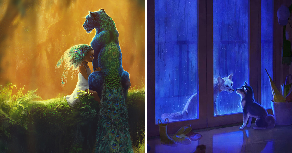 Mis pinturas suelen tomar alrededor de 2 a 10 horas. Utilizo el programa Photoshop CC y una tableta Wacom Cintiq… ¡las versiones actualizadas de lo que usaba cuando era niña! Mis temáticas favoritas para pintar son animales hermosos y criaturas fantásticas en contraste con un fondo luminoso. Me imagino a muchos de estos animales fantásticos cuidando de nosotros, observándonos, y trayéndonos magia cuando lo necesitemos.