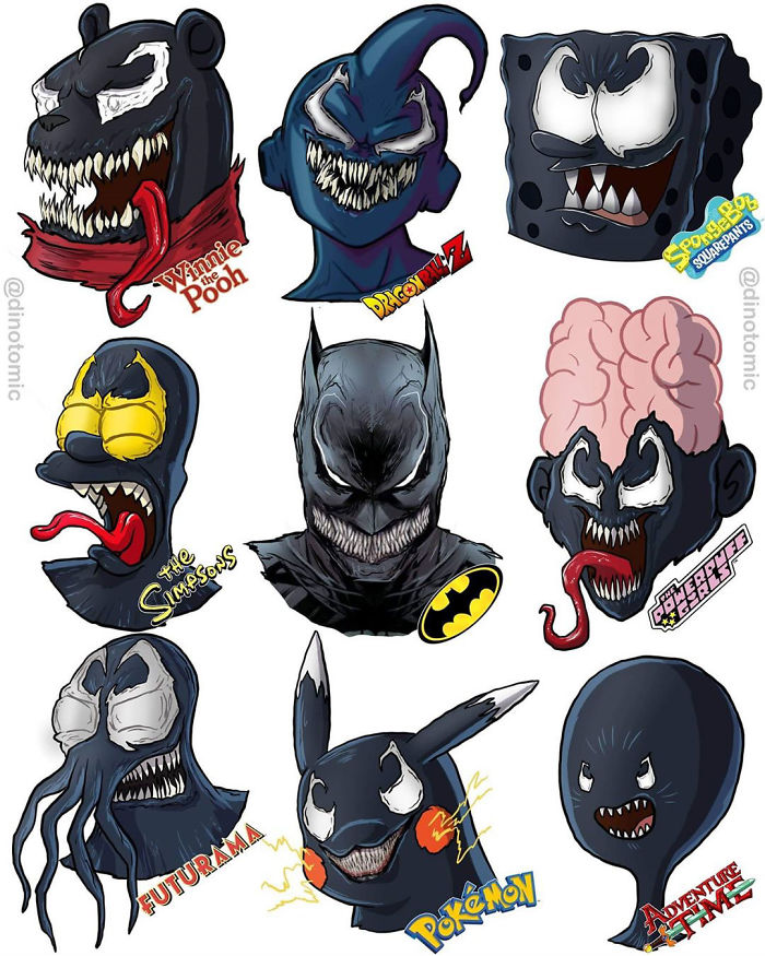 Dino "convierte" a cada personaje en uno de animación en 9 estilos distintos inspirados en Padre de familia, South Park, Rick y Morty, Tim Burton, Bola de dragón, Jojo's... Entre estos personajes hay famosos, raperos, personajes de cómics, videojuegos y demás. Y los resultados son geniales: demuestra que los personajes populares (sobre todo los ficticios) pueden entrar en cualquier universo de animación sin preocuparse de no ser reconocidos.