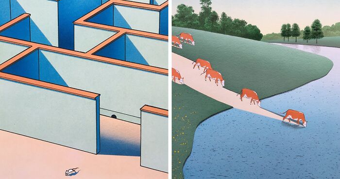 El arte surrealista, a pesar de que comenzó a desarrollarse hace algunas décadas, siempre ha sido muy popular entre la gente. Los pintores suelen inspirarse en diversas cosas o situaciones y, como Billout, tienen diferentes metas e intenciones artísticas con sus obras. Es esta variedad, junto a la sorpresa de encontrarse con imágenes que rozan lo absurdo, lo onírico o lo asombroso, lo que logra que las personas terminemos muy interesadas en las pinturas y las ilustraciones surrealistas como las que vemos en esta lista. Esto ocurre tanto en las redes como en los museos de la vida real, ya que, por ejemplo, recientemente se montó una exposición del artista surrealista latinoamericano Juan Campodónico. Este pintor definió al arte surrealista a su manera, como aquel en el que: “Ciertas sutilezas del alma deben aspirar a fusionarse con lo sagrado”.