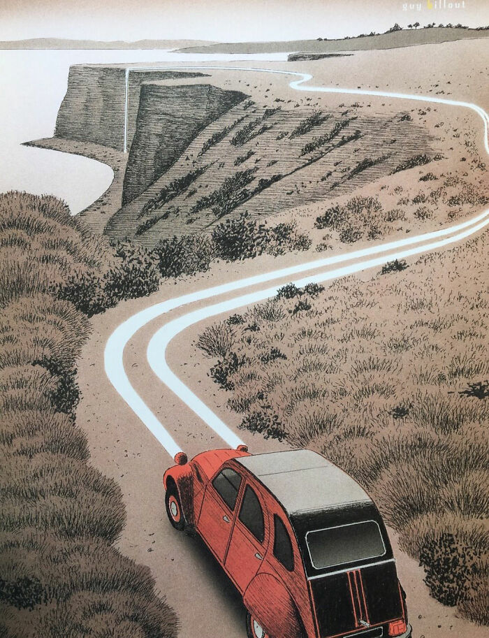 Guy Billout, un artista surrealista e ilustrador de Francia, es conocido por sus obras de arte que invitan a la reflexión y que desafían las leyes de la lógica: sus personajes suelen mantenerse en calma aun cuando se enfrentan a la destrucción inminente y sus trabajos están llenos de humor negro y optimismo. Nacido y educado en Francia, Billout se mudó a la ciudad de Nueva York en 1969 y comenzó su carrera en la publicidad. Sin embargo, se hizo famoso luego de que su trabajo fuera publicado en la revista New York, lo que le permitió expresarse en sus ilustraciones con libertad. Desde entonces, ha trabajado en varios medios importantes de EE. UU. como The New York Times, The Wall Street Journal y muchos más. Además, es autor de varios libros de ilustraciones.