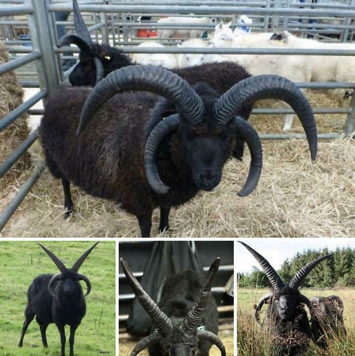 Ovejas de cuatro cuernos de las Hébridas. Se ven simplemente rudas