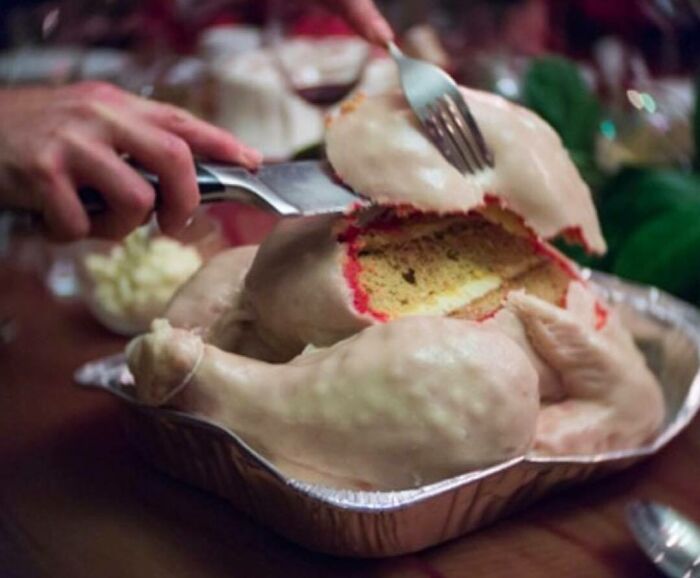 No sera buena idea, pero hay que admitirle que se lo a currado, si no lo corta y revela que es tarta, yo hubiese pensado que era un pollo crudo de verdad, al menos por su aspecto.