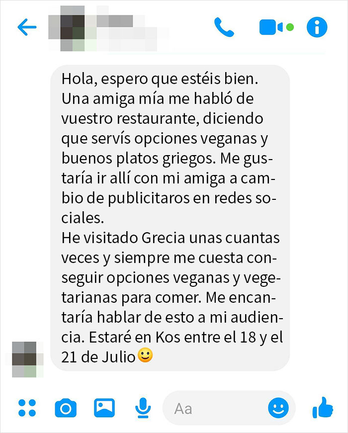 La gente ni siquiera sabría sobre esto si no fuera por uno de los miembros de la familia dueña del restaurante. Hace poco publicaron en Reddit capturas de pantalla de la conversación que tuvieron con uno de estos influencers, y corrió como la pólvora.