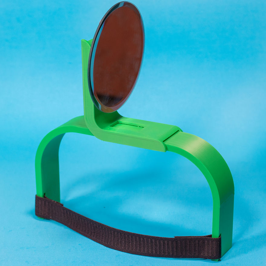 Con una banda elástica para sostenerlo en su sitio mientras el espejo te permite ver por encima del hombro